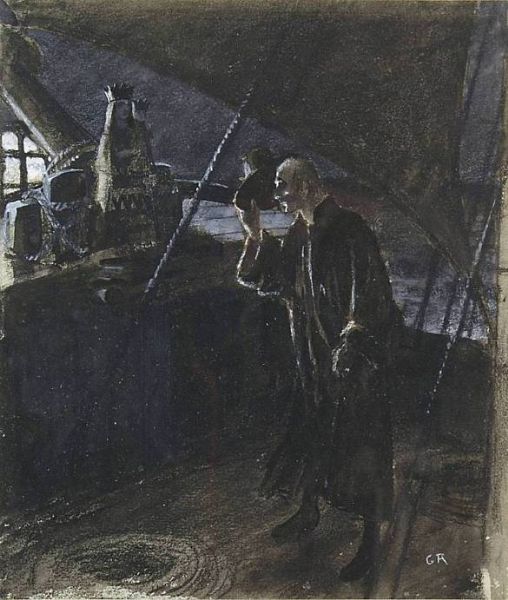 HOMME SALUANT SUR LE PONT D’UN BATEAU AU CLAIR DE LUNE