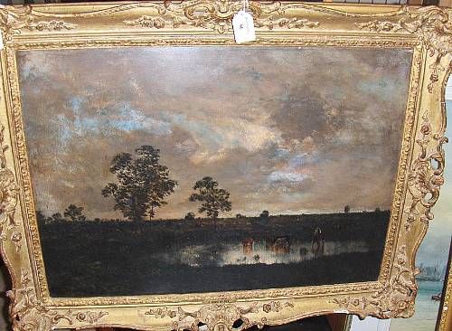 Cattle watering by a pool at twilight,
