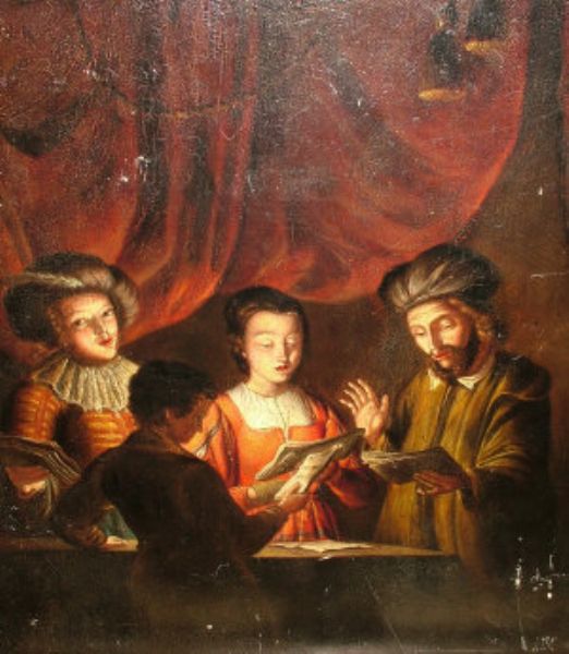Four figures reading from a sermon by candlelight