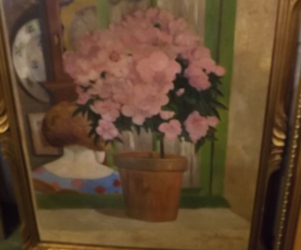 | Still Life study of a pink flowering plant on a windowsill, figure beyond | |
