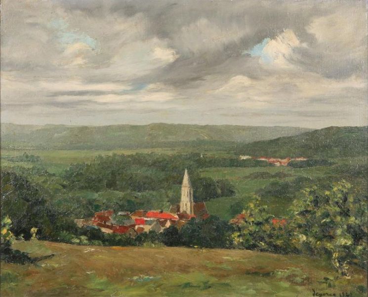 Hilly landscape with village and church tower.