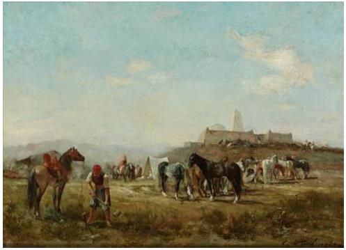 | Paar Gemälde mit orientalischen Reiterszenen. Zum einen: drei bewaffnete Reiter mit Pferden auf Erkundung. Zum anderen: Pferdehe | |