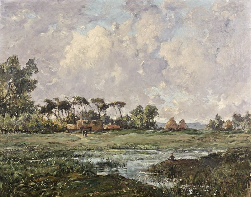| PAYSAGE AVEC FERMETTE ET PECHEUR AU BORD D’UNE MARE AU PREMIER PLAN. | |
