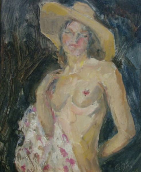 Standing female draped nude in a sun hat
