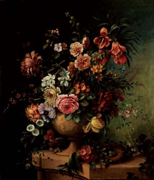 | Peonies, tulips, lilies, roses, insects and bird’s nest in an urn on a stone ledge | |