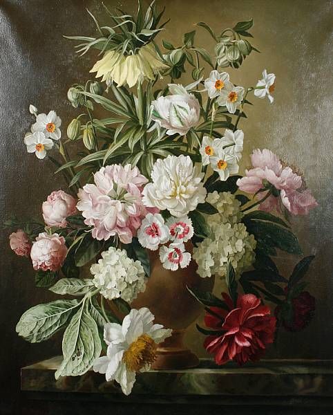 A lily, peonies, narcissi and roses in a vase on a ledge