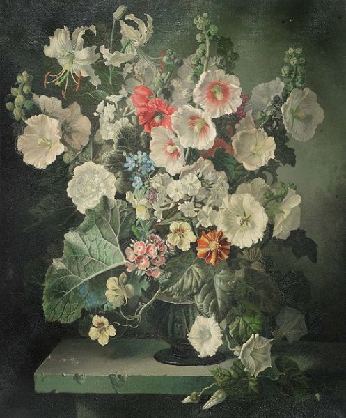 | Still life - A vase of hollyhocks, carnations, lilies and sweet williams upon a marble ledge | |