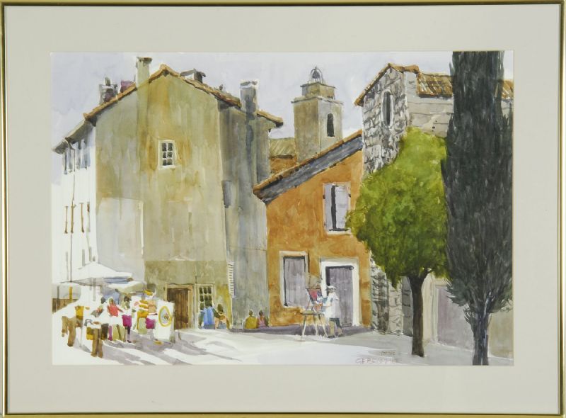 European-style houses, open air market, and street painter.