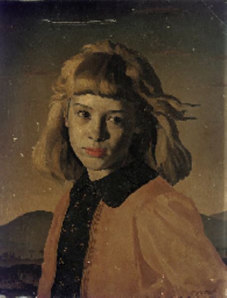 | Portrait of a young girl, quarter-length, in a black dress with brown cardigan, an extensive landscape beyond | |