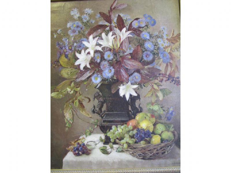 | Still life vase of lillies, blue daisies and sprigs of blackberries, standing aside a bowl of fruit | |