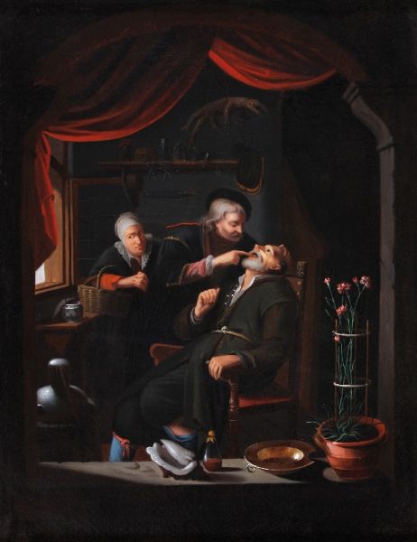 | A dentist examining the tooth of a man seated in a chair, an old woman peeping through a window | |