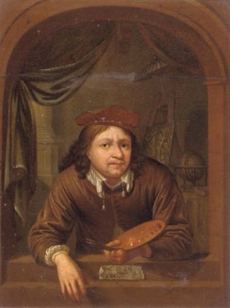 | Portrait of Gerard Dou leaning from his studio window, brushes and palet in his hand | |