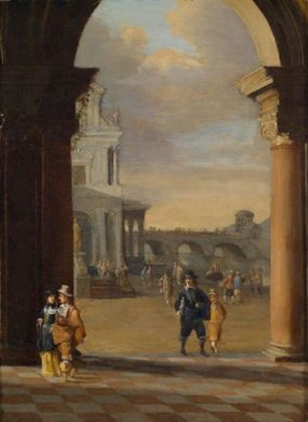 | View of a palace and an arched stone bridge with rich figural staffage | |