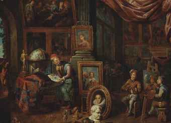 | The artist's studio, with the master holding a drawing by a table, a pupil portraying a musician, and other pupils in the backgr | |