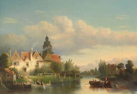 | Abendliche Flusslandschaft mit übersetzendem Boot und reizvoller Architekturansicht mit zahlreichen Figuren | |