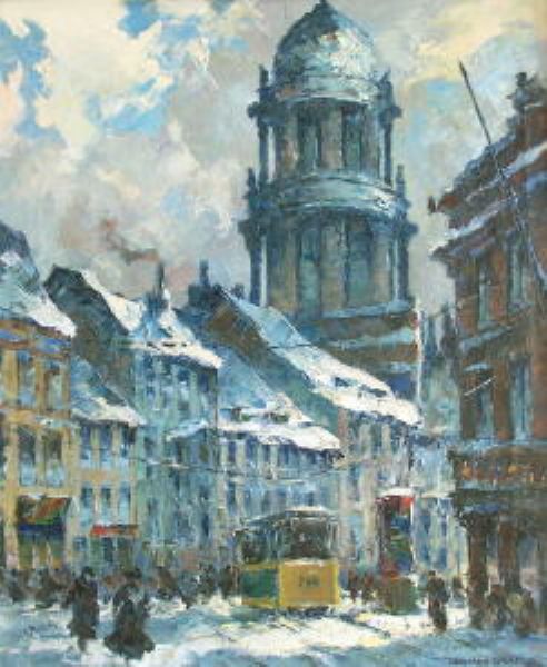 | Winterliche Straßenansicht von Berlin Mitte mit Stadthaus, Straßenbahn und reicher Figurenstaffage | |