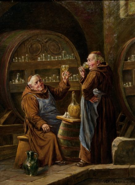 | Die Weinprobe. Darstellung zweier geselligen Mönche in einem Gewölbekeller bei der Weinprobe, vor einem Eichenfaß. | |