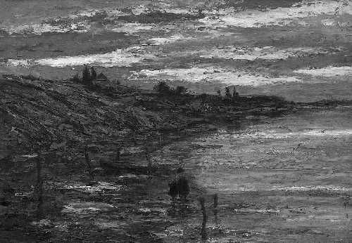 Abendliche Landschaft mit zwei Kindern am Wasser