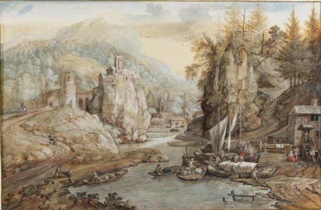 | A MOUNTAINOUS RIVER LANDSCAPE WITH BOATS BEING UNLOADED, A HILL-TOP CHURCH AND A VILLAGE IN THE DISTANCE | |