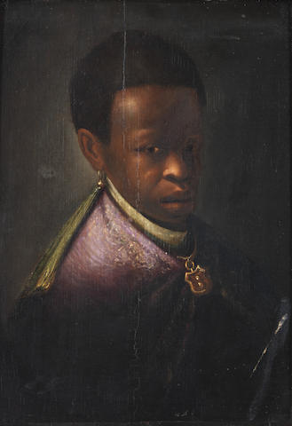 Portrait of a black boy, bust-length, in a cloak, gold clasp and an earring