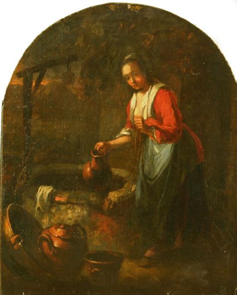 | Study of a Woman wearing a Red Dress collecting Water with a Jug from a Well, Kitchen Utensils nearby, a Landscape beyond | |