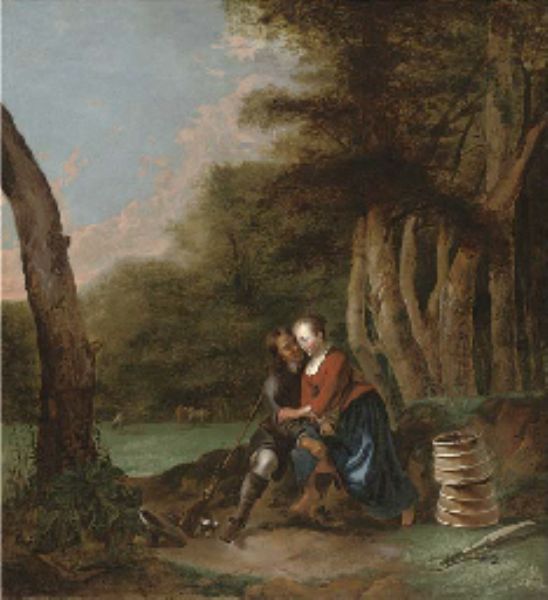 | A huntsman courting a milkmaid under a tree in a meadow | |