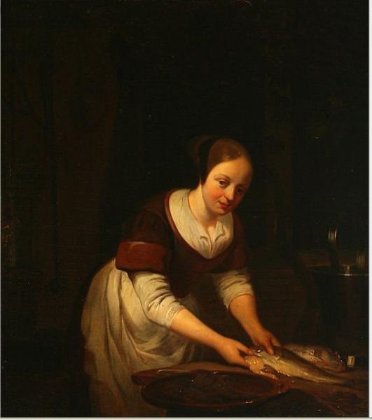 A young woman cleans fish