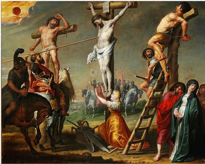 | A pair of biblical motifs with Jesus Christ groaning under the weight of the cross and The crucified Jesus Christ | |