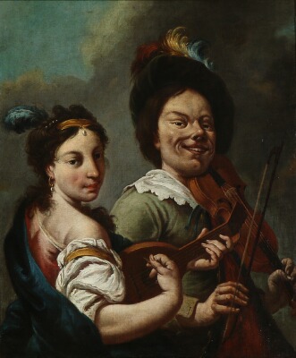 | A woman is playing the mandolin while a dwarf is trying to play the violin | |