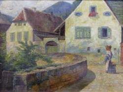 Sonnenbeschienene Dorfstraße mit Bäuerin