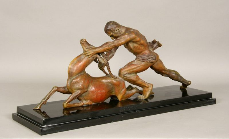 | a muscular man wrestling down an antelope. | |