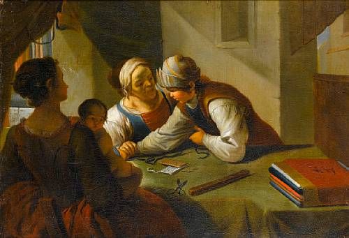 | A lady visiting a tailor's workshop with her child; and An interior with two ladies, and a young boy eating and drinking | |