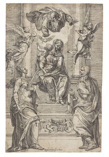 | Thronende Madonna mit Kind und zwei Heiligen, darüber Gottvater, Heiliger Geist und zwei Engel | |