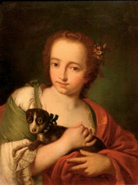 | A young woman in a green dress and a red wrap, with a dog in her arms | |
