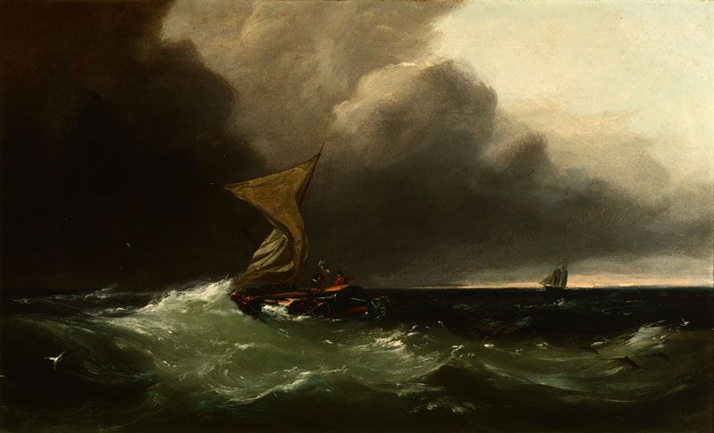 | Shipwrecked figures signaling to a distant sailing ship | |
