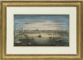 | An excursion steamer clearing her berth and heading down river towards London Bridge, her decks crowded with passengers | |