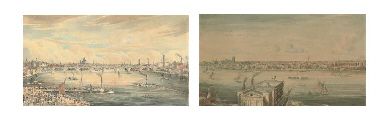 | View of Waterloo Bridge, eastwards from the north bank of the Thames, St Paul's beyond; and View from above Goding's New Lion Al | |