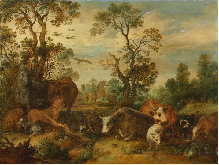 | LANDSCAPE WITH CATTLE, HORSES, A CHEETAH, A CAMEL AND OTHER ANIMALS | |