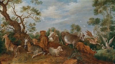 Ziegen, Kühe und Gänse in einer bewaldeten Landschaft