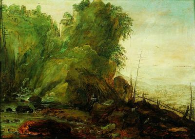SCÈNE DE RIVIÈRE ET PAYSAGE PANORAMIQUE AVEC UN ERMITE