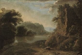 | An Italianate wooded river landscape with a figure by a ruin | |