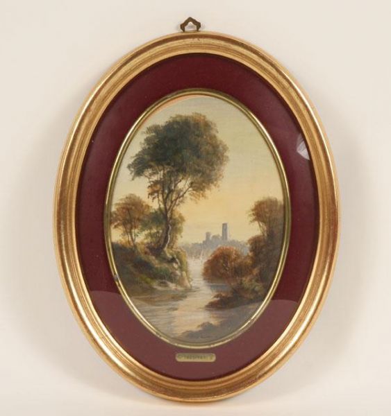 | lot of two miniature landscape paintings on celluloid, one depicting a cathedral in the distance, the other a bridge before a ho | |