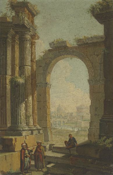 | Figures in oriental costume standing in classical ruins, the Castel Sant'Angelo and the Dome of Saint Peter's beyond | |