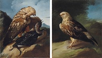 | A buzzard attacking a cormorant in a landscape; and A buzzard in a landscape | |