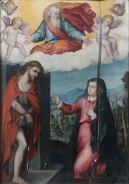 | LE CHRIST AUX LIENS ET AUX ROSEAUX, VISITÉ PAR LA VIERGE MARIE ET DOMINÉ PAR DIEU LE PÈRE ET LES ANGES | |