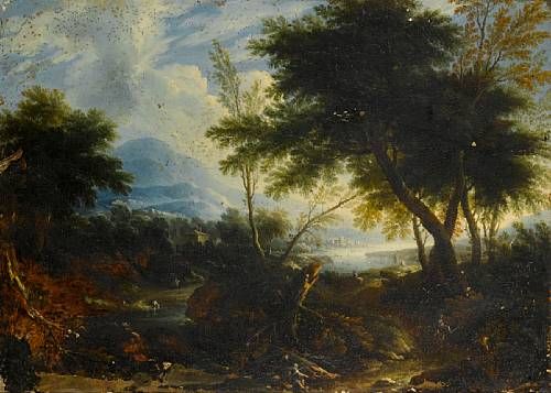 | A wooded river landscape with a horseman on a country path; and An extensive river landscape with a drover and his herd crossing | |