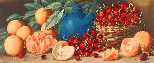 Oranges & Cherries on a Ledge with Basket and Blue Pitcher