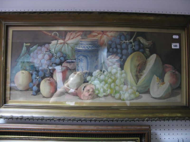 Still life study of fruit surrounding vase