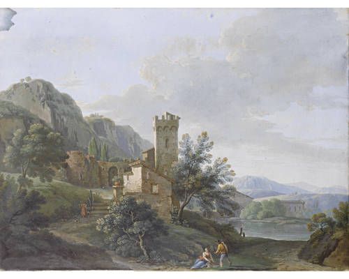 | Figures resting before a walled village, mountains and a lake in the distance | |
