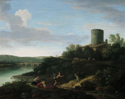 | Roman landscape with the Tiber and the Milvian Bridge, also known as “Ponte Mollo” | |
